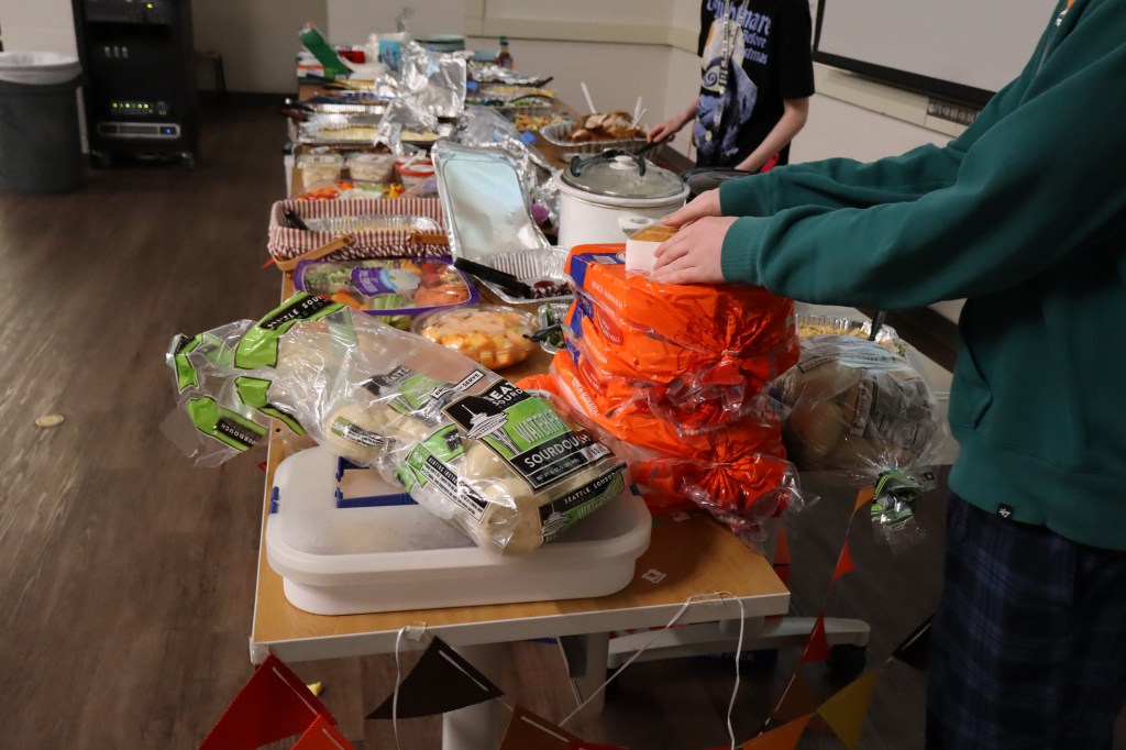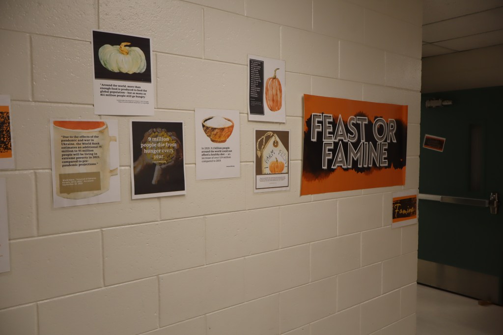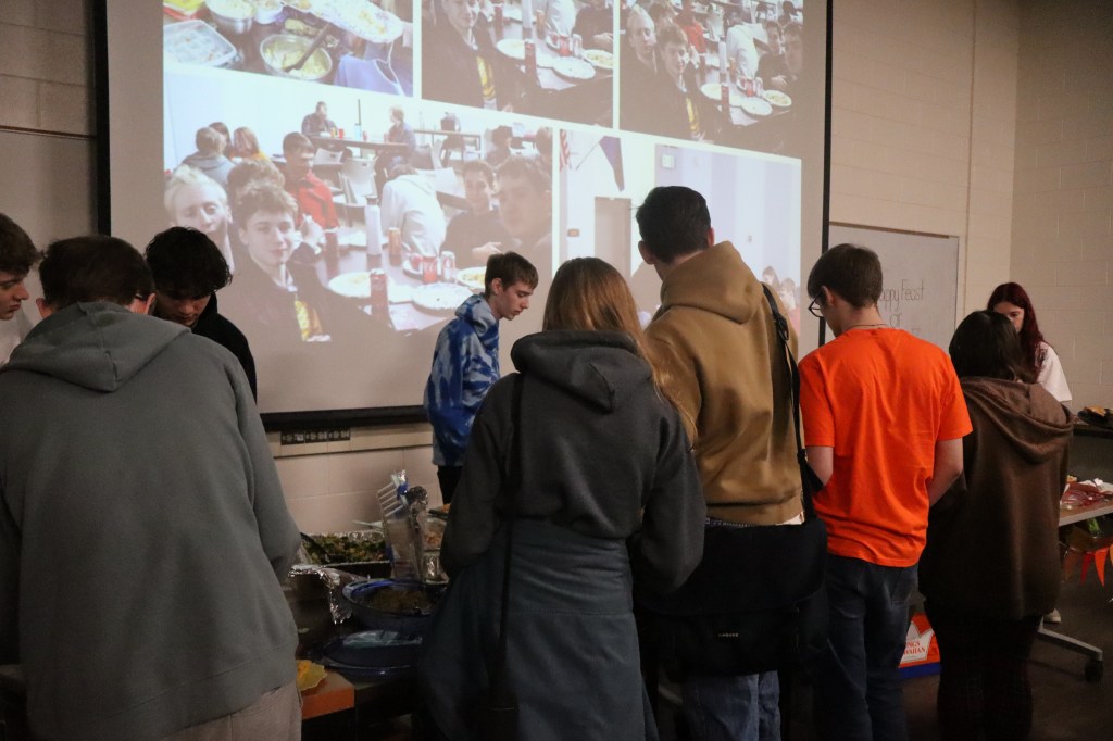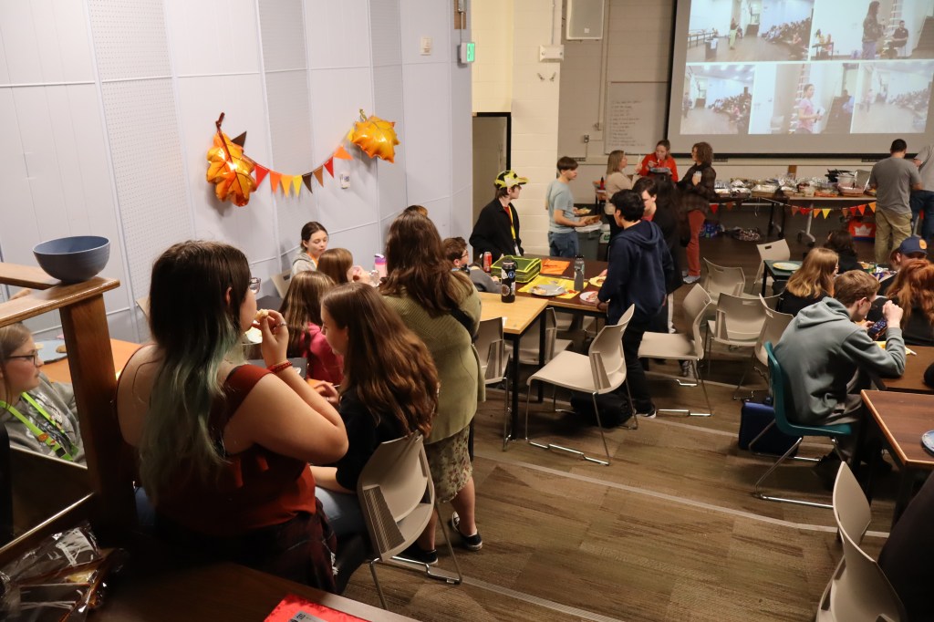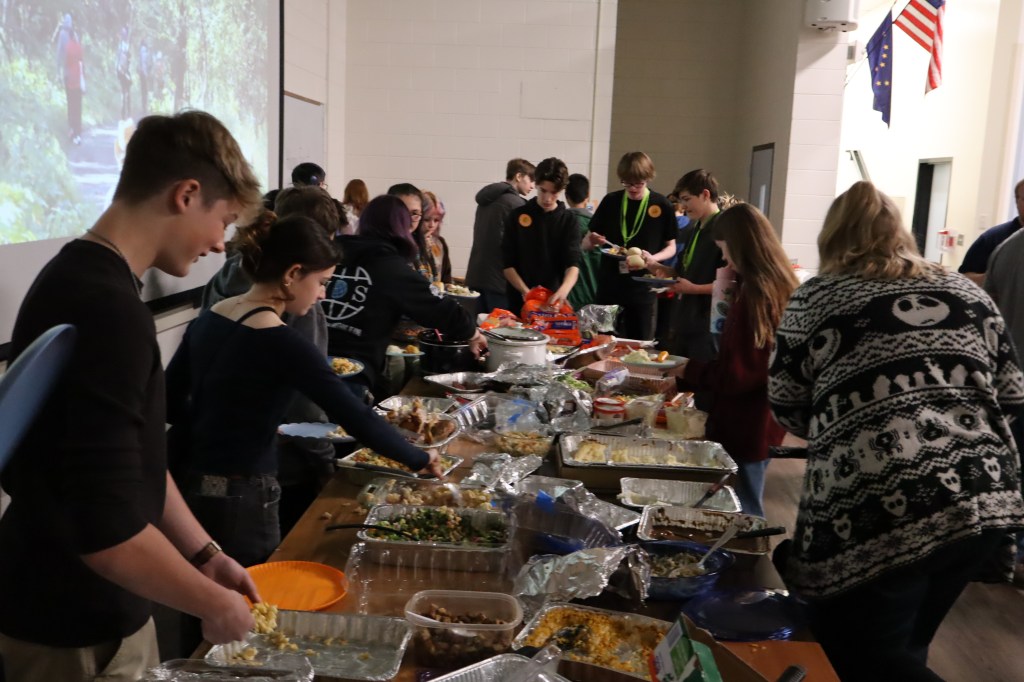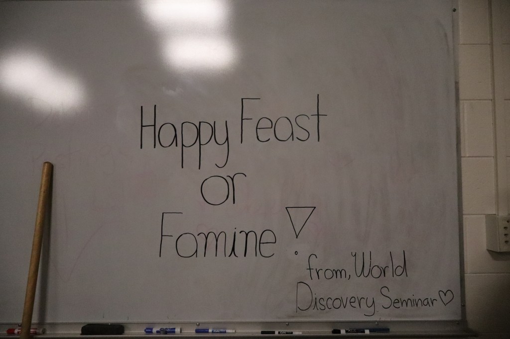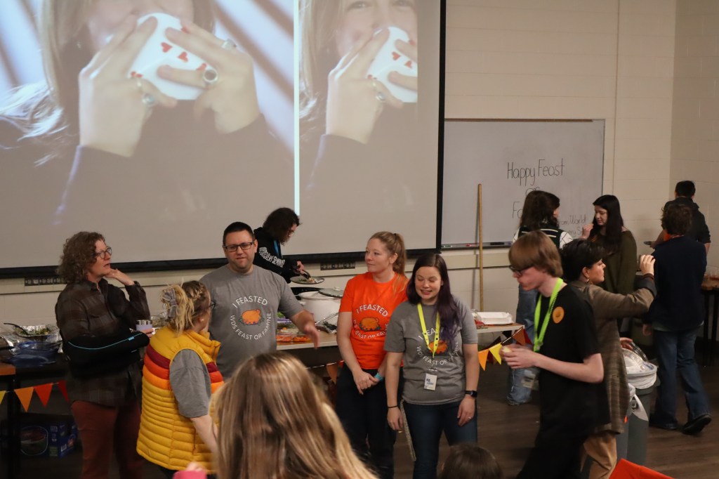 Feast or Famine 2024 was held on November 22nd and raised over $1,000 and hundreds of pounds of canned goods for local food programs. Feast or Famine is a food scarcity simulation, representing the 39% of people world wide who do not have access to adequate daily nutrition. Students and staff draw from a bowl either “feast” or “famine.” The number of slips correlates to current statistics. Those who draw feast get an excellent thanksgiving potluck; those who draw famine are taken to a side room for white rice and water.
