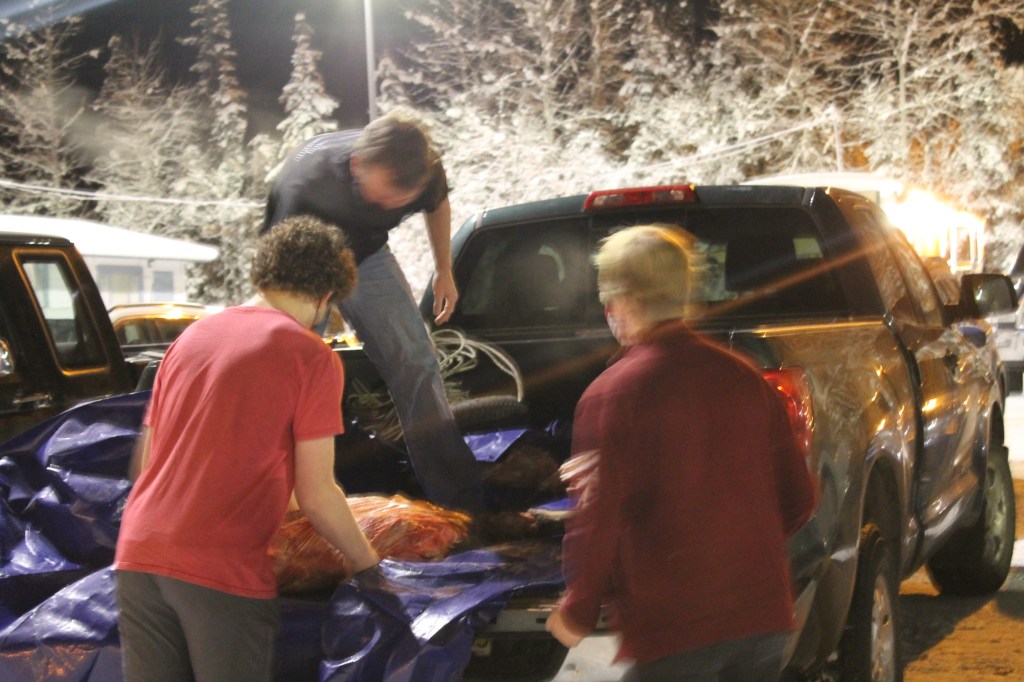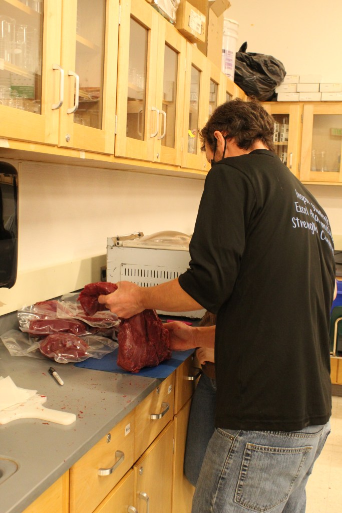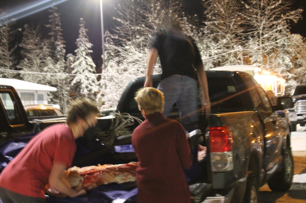 What happens to the meat? Students who help process get to take a pound of meat home to their families. The rest is packaged and delivered to families in need and other local food bank organizations. The student government provides a chest freezer for this purpose each time a moose is harvested.