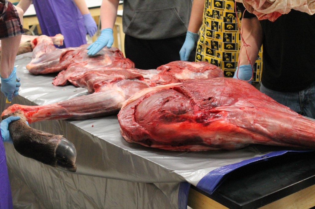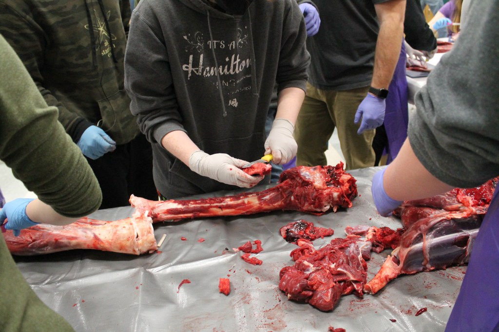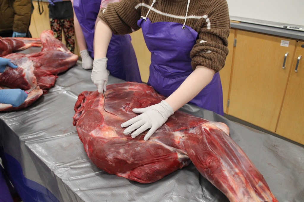 “What I try to emphasize — and the World Discovery Seminar program as a whole — is to emphasize experiential learning,” he said as nearly 30 of his students used thin knives to slice up the carcass. “You can learn certainly about anatomy from diagrams and textbooks and videos but getting your hands on an animal is a big part of the science aspect of it.”