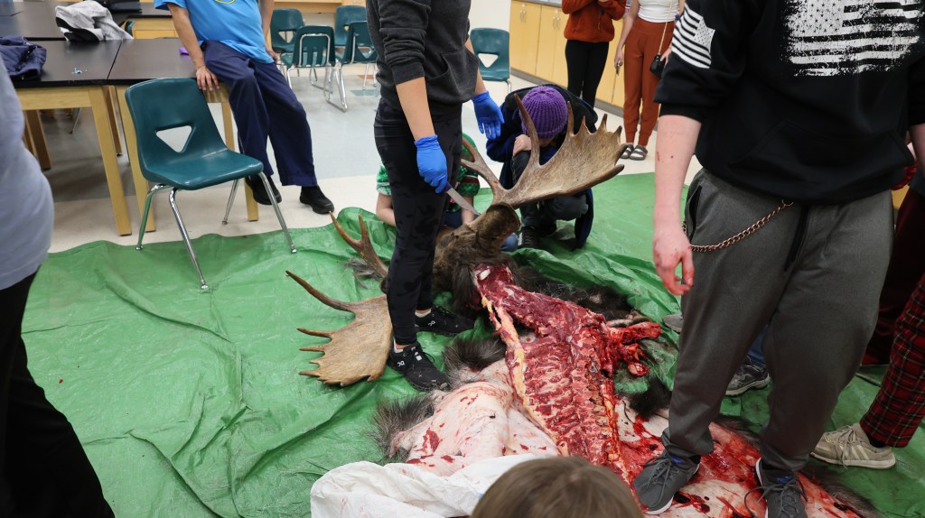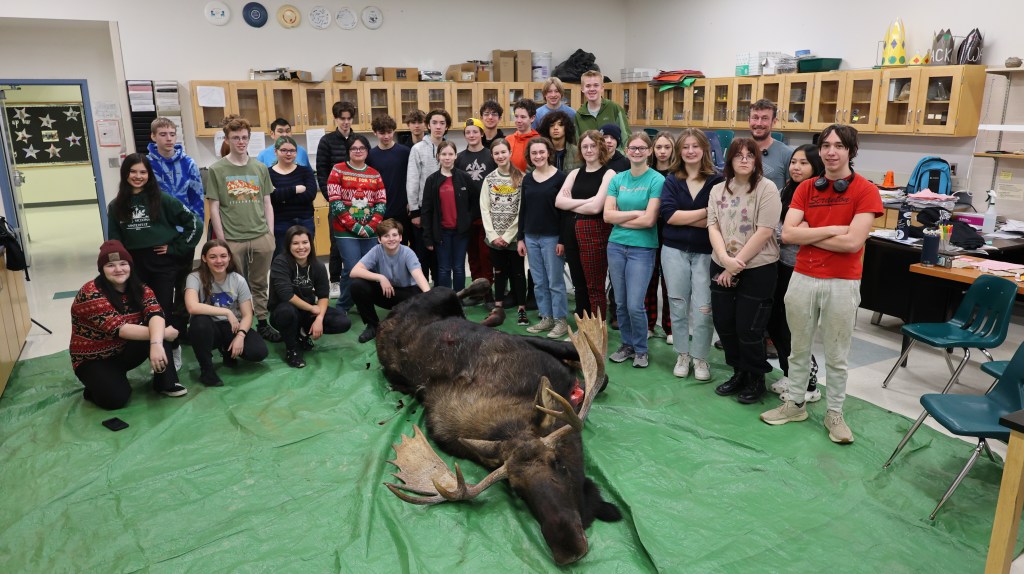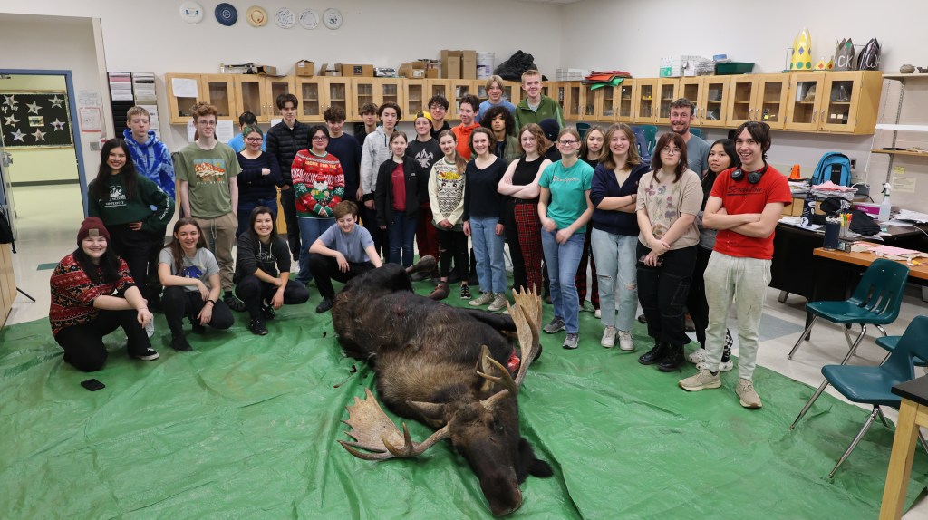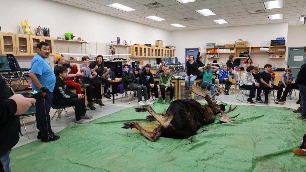 This is the third time Mason has harvested a moose on a cultural education permit, though the first time he’d brought an entire moose into the classroom. He shot the bull, which had antlers spanning 52 inches, near Big Lake on Dec. 3.