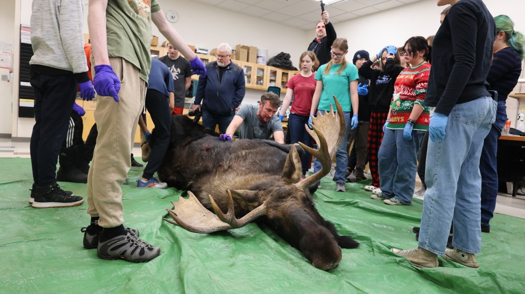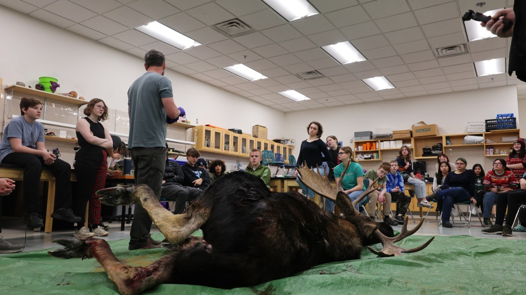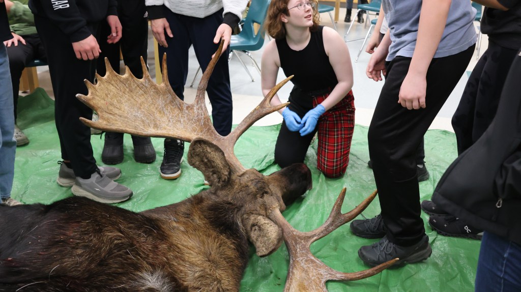 There were some squeamish moments early in the lesson. While showing the students how to separate the moose’s hoof from the rest of its leg, Mason warned there would be a somewhat sickening sound — then demonstrated that sound by snapping the hoof off with a loud crack. Some students squirmed in their seats.