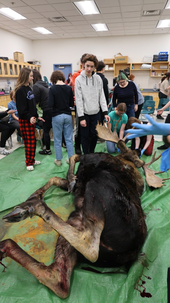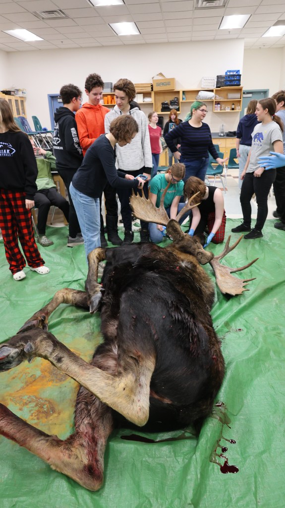 The whole moose “thing” began a few years ago when WDS Biology teacher Brian Mason first applied for an educational harvest permit with the Alaska Department of Fish and Game. This allows him to go out and harvest a moose with the goal of bringing it back into the classroom full a full processing by the students. This aligns with the anatomy unit of biology and with the Alaska studies curriculum, which WDS freshmen partake in about every other year: Brian has been successful in harvesting a moose in 2019, 2021, and 2023.