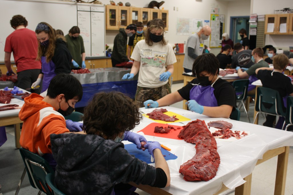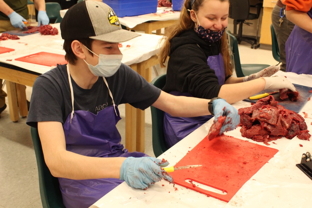 However, the students were able to learn how to debone, trim and process the meat in a clean and safe way. That meant giving them a brief lesson on moose anatomy before handing out gloves and 4-inch deboning knives to start cutting under the supervision of Mason and a couple parent volunteers.