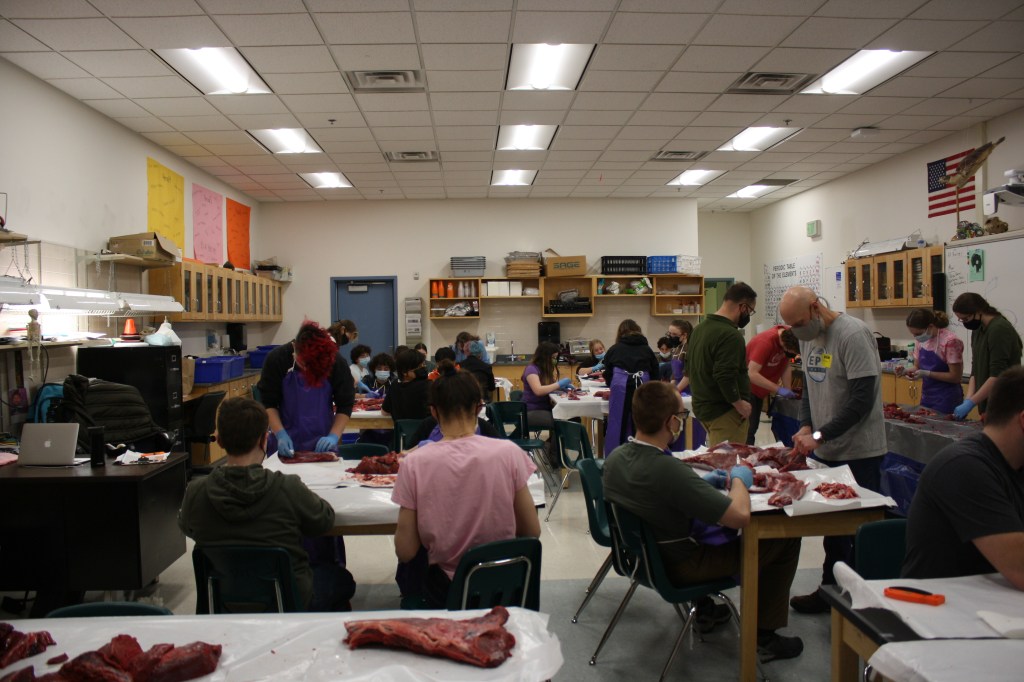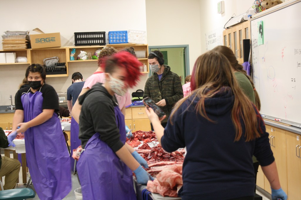 Who all helps make this happen? We are very lucky to have support from Alaska Butcher Equipment and Supply in Mountainview, who helps to supply meat grinders and other processing equipment. We have also partnered in the past with Ralph Elook; Alaska Strong Coordinator; with ASD Title VI Indigenous Ed, who is an incredible member of the Chugiak community, and Evon Peter, a professor at UAF and elder originally from Arctic Village. We are also very lucky to have an incredible community of staff at Chugiak High school, including our administration who always supports this project and the WDS Program in general, and the teachers who always work hard to make sure that all the WDS freshmen can attend this full-day (sometimes more) “field trip” in lieu of their normal classes.