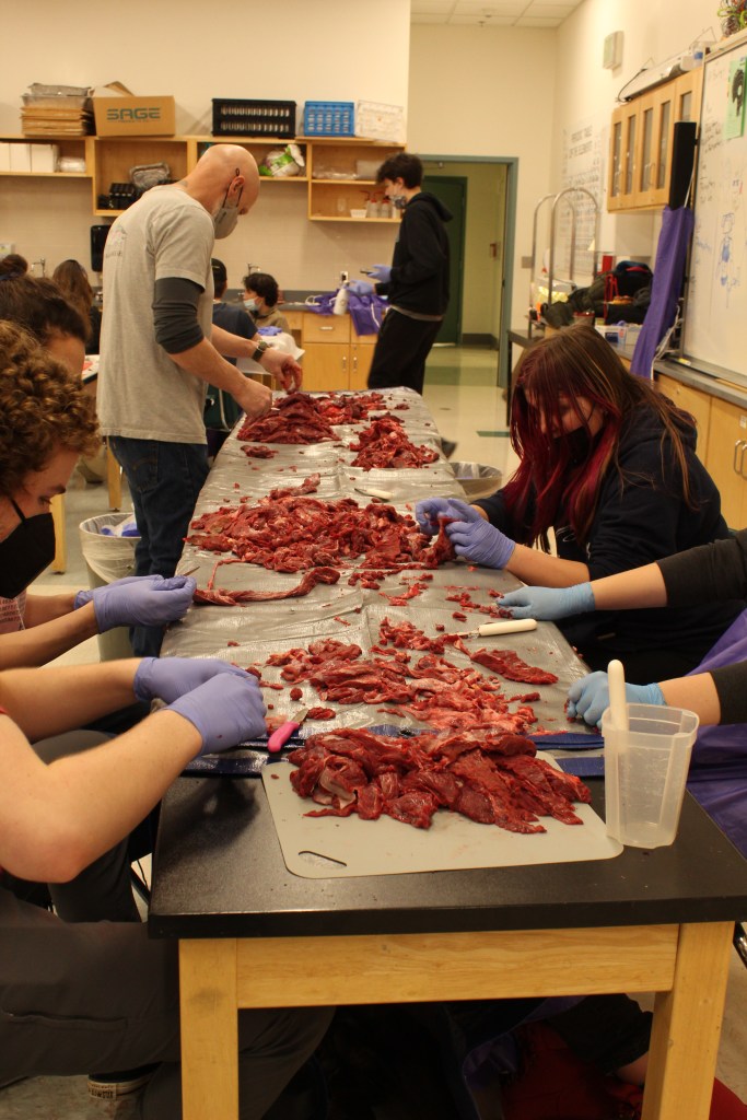 As the lesson wore on, students sat at tables removing fat, tendons, bone, hair and any dirt or debris from the meat. With so many working on the animal, the butchering actually went remarkable fast.