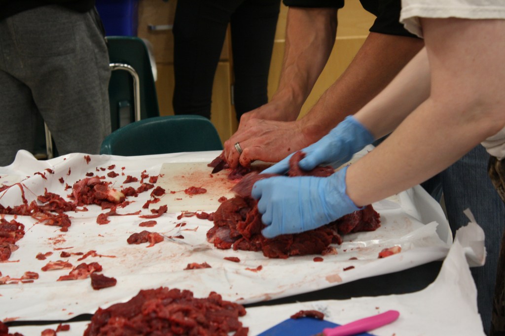 The class spent a couple days skinning, quartering and deboning the animal before trimming and grinding the meat into hamburger.